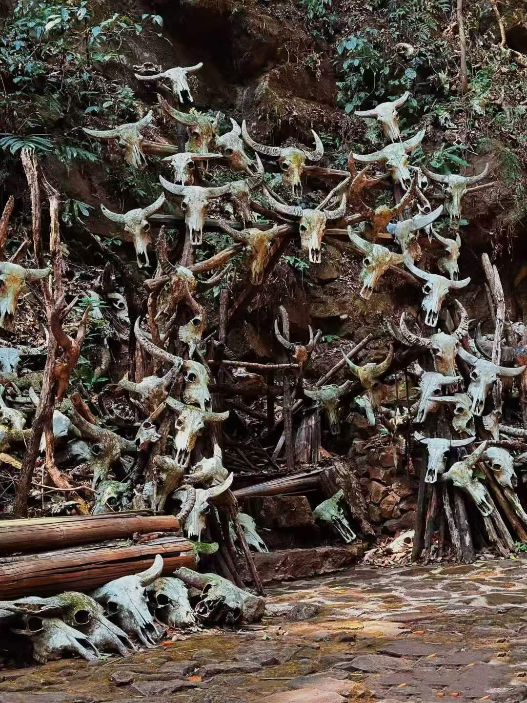 不计其数的牛头骷髅依山势错落有致地悬挂于残崖绝壁和苍天古木之上,给人强烈的视觉震撼!