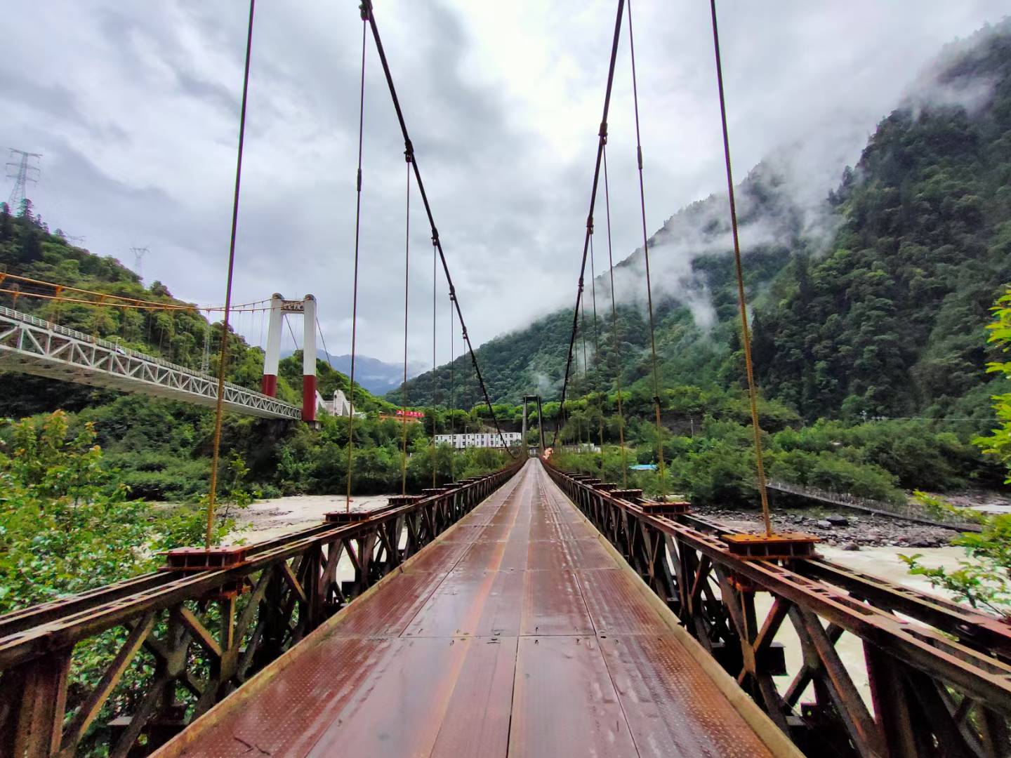 通麦大桥是川藏公路318国道的咽喉工程,是一座临时保通性工程。大桥设计为双塔双跨悬索桥,跨越帕隆藏布的支流易贡藏布,全长258米,主跨为210米,高31.5米,该桥的建成使中断的318国道得以畅通。
