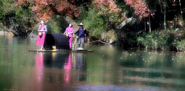 乘坐竹筏游览【落羽红杉林】,焰红的红杉扎根在水中,与蓝天青山相映,就像是倒在水中的一幅油画。