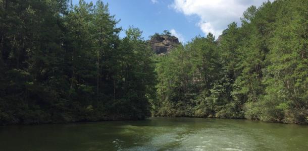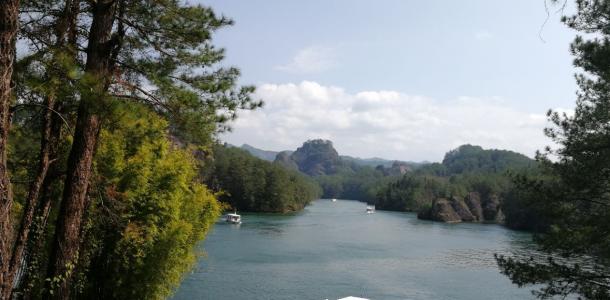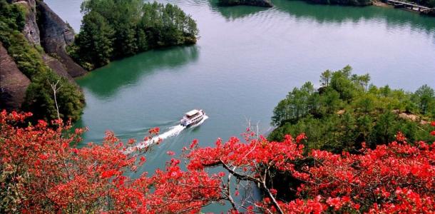 石门湖位于连城冠豸山东南,两岸是满眼青葱的高山,湖水光滑如镜犹如一块镶嵌在冠豸山险峰奇谷之间的翡翠,水随着山势蜿蜒流淌,碧水青山交相辉映,荡舟其中好比置身山水画间,无处不在的清幽、碧绿让人倍感放松。